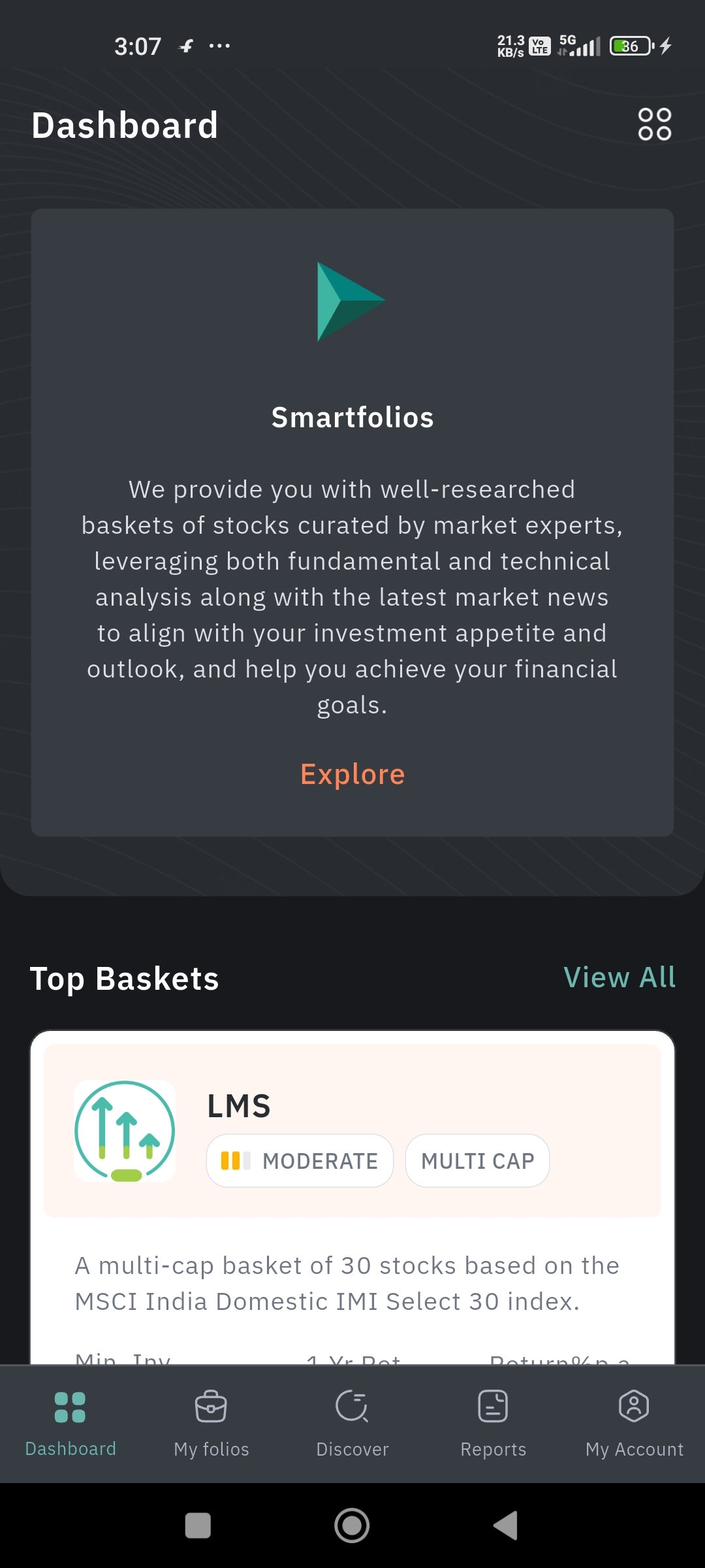 If you are new to 'Smartfolios,' your Dashboard page will be empty, and you will be provided with the 'Top Baskets.' If you wish to explore more,